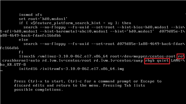 3. 부팅설정을 변경했다면 Ctrl + x 입력해서 부팅 시작 -> 싱글 모드 접속