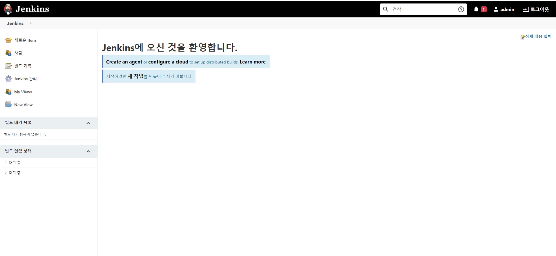 continue를 누르면 jenkins main화면이 나타납니다.