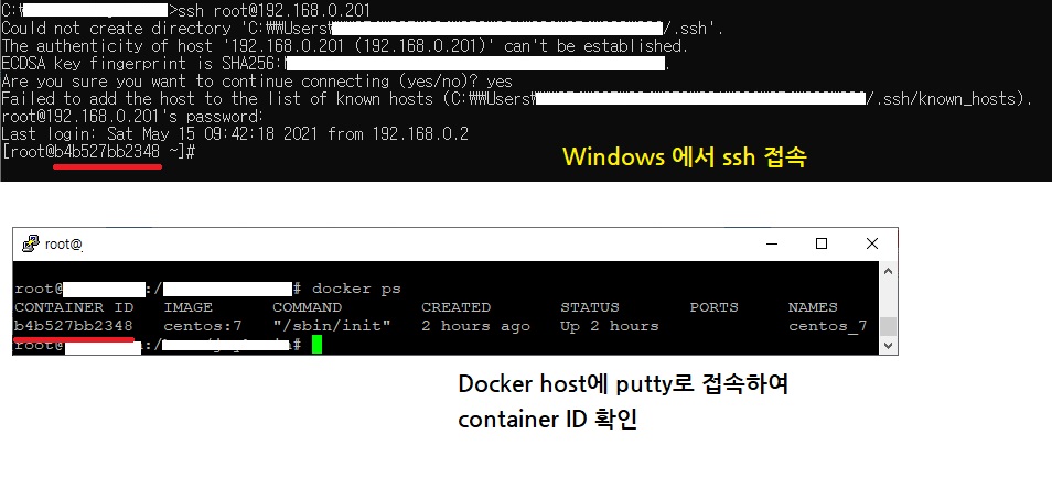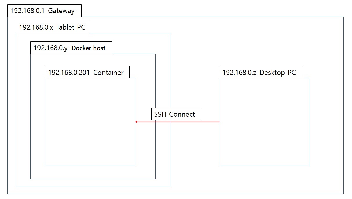 그리고 그림과 같이 ssh 접속을 시도하여 docker host가 아닌 외부장치에서 container로 ssh 접속을 시도하여, 외부 장치가 container에 직접 접근이 가능한지 검증해볼 생각입니다.