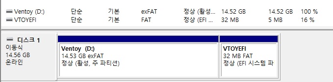 3.Ventoy 설치가 완료되면 usb 메모리는 아래와 같이 파티션이 생성됩니다.